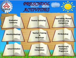 • In Selangor and Perak, the core activities (Sports, Story-telling, Rhymes & Colouring Competition, Thevaram Competition and also Graduation Ceremony) have been organized and implemented with the support of the preschool teachers by CHILD Secretariat. Kedah, Pulau Pinang and Melaka will organize the activities individually
